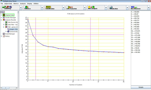 Currently, FOM is available for the CAST, K-means and K-medians algorithms. A figure of merit is an estimate of the predictive power of a clustering algorithm. It is computed by removing each sample in turn from the data set, clustering genes based on the remaining data, and calculating the fit of the withheld sample to the clustering pattern obtained from the other samples. The lower the adjusted FOM value is, the higher the predictive power of the algorithm. The "Maximum number of clusters" input field under the K-Means / K-Medians tab in the initialization box is used to determine how many times FOM values should be calculated for the k-means/k-medians algorithm.