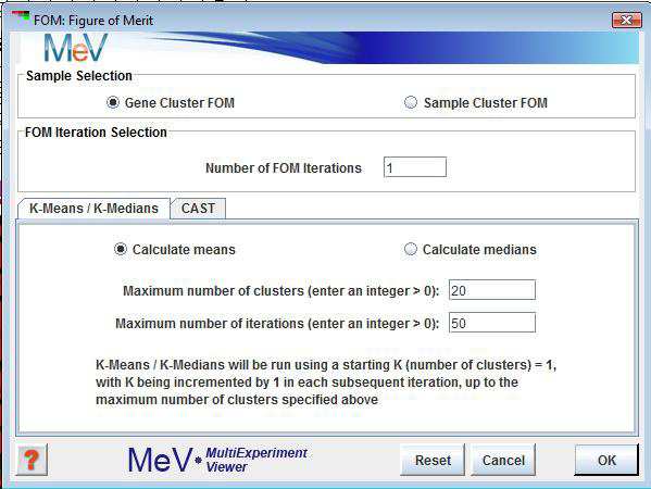 The Figure of Merit is, in concept, a measure of fit of the expression patterns for the clusters produced by a particular algorithm. MeV's FOM implementation provides FOM results for running the KMC and CAST clustering algorithms. Each algorithm is initialized by selecting either the K-Means/K-Medians tab or the CAST tab.