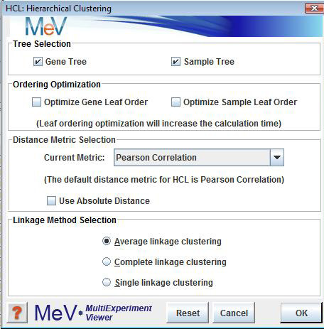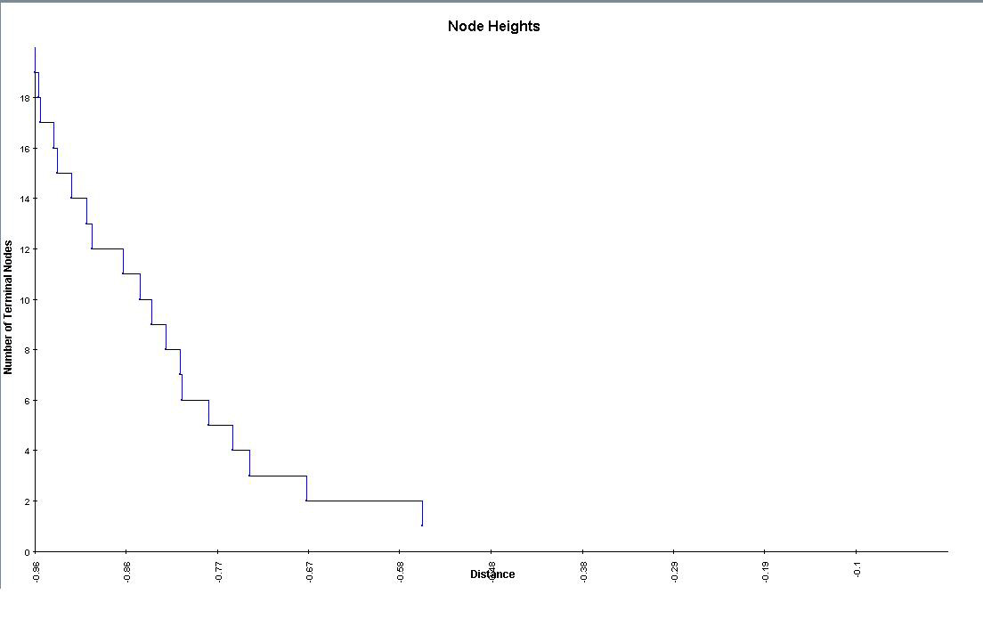 Selecting this analysis will display a dialog that allows different linkages and options to cluster genes, samples or both. Once the computations are complete, select the nodes Analysis->HCL->HCL Tree to view the hierarchical tree. The display is similar to the main display, but similar genes and experiments are connected by a series of ‘branches.’ Labels are displayed on the right side.Clicking under a branch intersection (node) will select that node and the subtree below that node. Once selected, right clicking in the same area will display a popup menu that allows the user to set the highlighted area as a cluster, name the cluster, save the cluster and set several tree options. Clusters set and named in this display can propagate to other displays. Saving a cluster will display a dialog where a tab delimited text file containing the data for the highlighted cluster can be named. The algorithm also produces a Node Height Graph which displays the number of terminal nodes in the tree given a particular inter-node distance threshold.