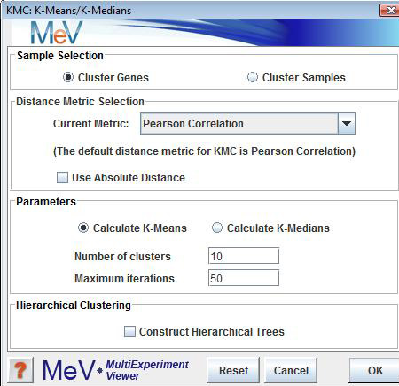 The Means or Medians option indicates whether each cluster's centroid vector should be calculated a mean or a median of the member expression patterns.