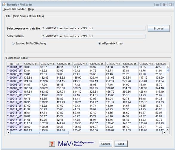 Use the button in the panel to locate the file to be loaded. The selected file will be displayed in a tabular format in the file loader preview table. We currently allow loading GPL and GSM format files using this loader. The platform information contained in the GPL files is automatically loaded. There is no provision to load the platform information separately. Click the cell in the table which contains the upper-leftmost in the file, then click the Load button to load the file.