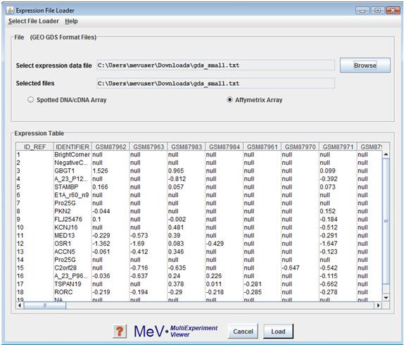GEO GDS format file can be loaded using the button in the File panel. Select to indicate the data-type of the loaded expression data.