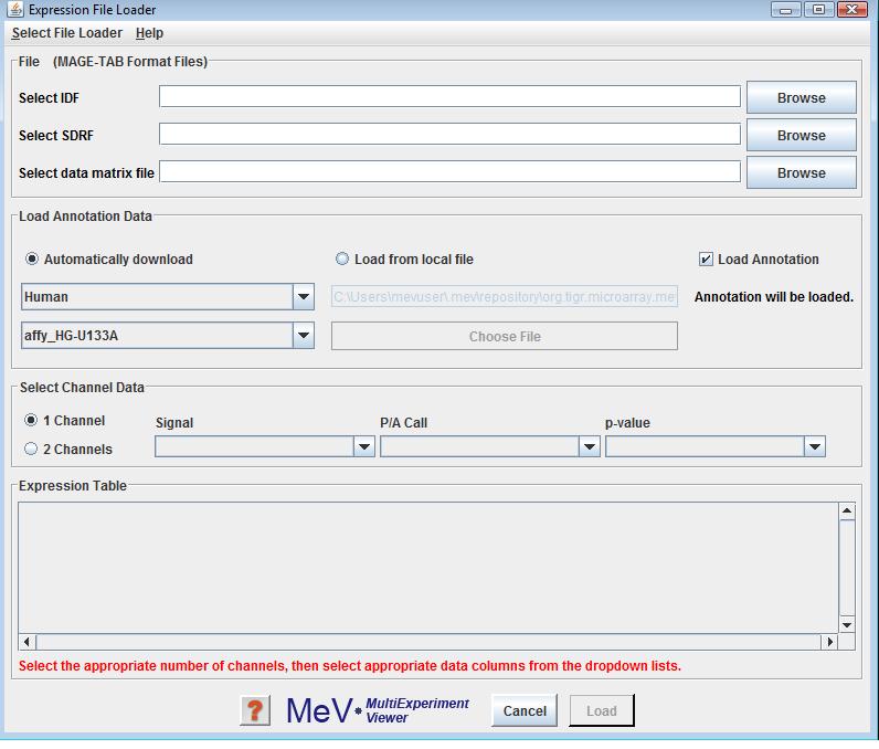 The 1 channel / 2 channel radio buttons indicate whether the data is derived from 1- or 2- channel hybridizations. Depending upon which radio button is selected, MeV will display either Signal, Detection and p-Value combo boxes, or Intensity1, Intensity2 and Log Ratio/Ratio combo boxes. The Log Ratio/Ratio combobox may be used for either Log(ratio) or ratio data. Each drop-down list includes all of the data type items from the second row of the MAGE-TAB data matrix file plus one additional entry, “none”, to allow the user to select no value for the combobox. The user must know and understand the data well enough to make appropriate selections for these lists. The data section merely displays the data from the selected data matrix file. No interaction with this section is necessary. The ‘Load’ button is inactive until the user provides a data matrix file. The Load button will then be activated.