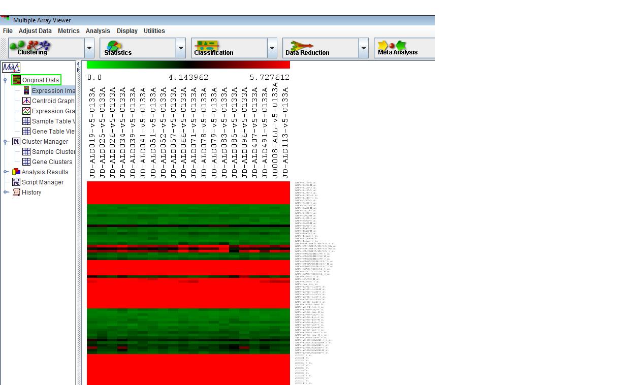 Once a data matrix file has been selected and displayed, the user can select ‘Load’ to load and parse the data matrix file. MeV will display the data matrix as a heat map with row labels derived from the first column of the data matrix file. Once the data have been presented as a heat map, all other MeV functionalities will be available for use.