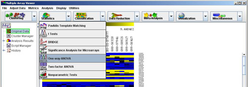 Each of these modules can be launched from the menu or from a button on the Multiple Array Viewer toolbar. New to MeV 4.2, the toolbar groups modules into seven categories: Clustering, Statistics, Classification, Data Reduction, Meta Analysis, Visualization, and Miscellaneous. Clicking on the category icon brings a drop-down list of analyses within that category. Common to all clustering modules the selected algorithm can be performed to cluster genes or samples. In the title of the analysis module descriptions which follow, the acronym used to label the module’s button is followed by the name of that module. Below this is a line containing the reference(s) used in implementing the algorithm.