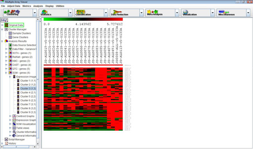 An SOM structure to which expression elements are associated to form clusters. Each node contains an SOM Vector.