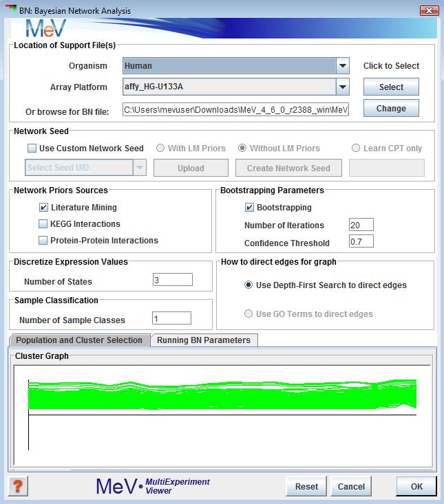 , that there is max limit in terms of number of genes that this algorithm can handle. If a cluster is chosen that exceeds the maximum genes limit an error window is displayed showing the maximum allowable number of genes. At this point the user can choose a new cluster, if one is already defined and is below the limit. If a cluster of allowable size is not defined, the user needs to cancel out of BN window, create new cluster(s) and then launch the BN Analysis window again.