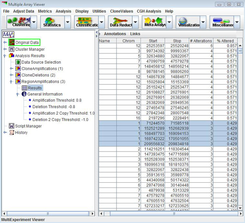 The CGH Analysis menu contains a number of algorithms for searching for data regions that are consistently altered throughout the experiments. These algorithms can be performed on probes, genes, and data regions (minimal common regions of alteration).