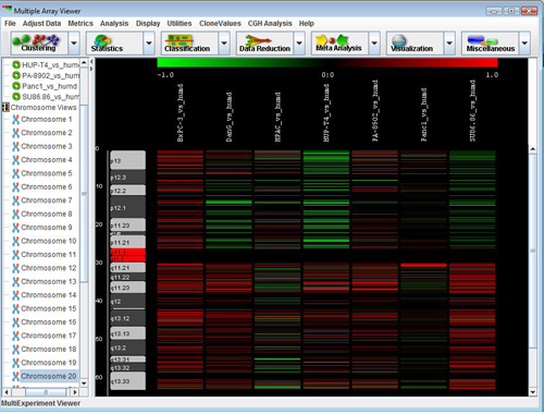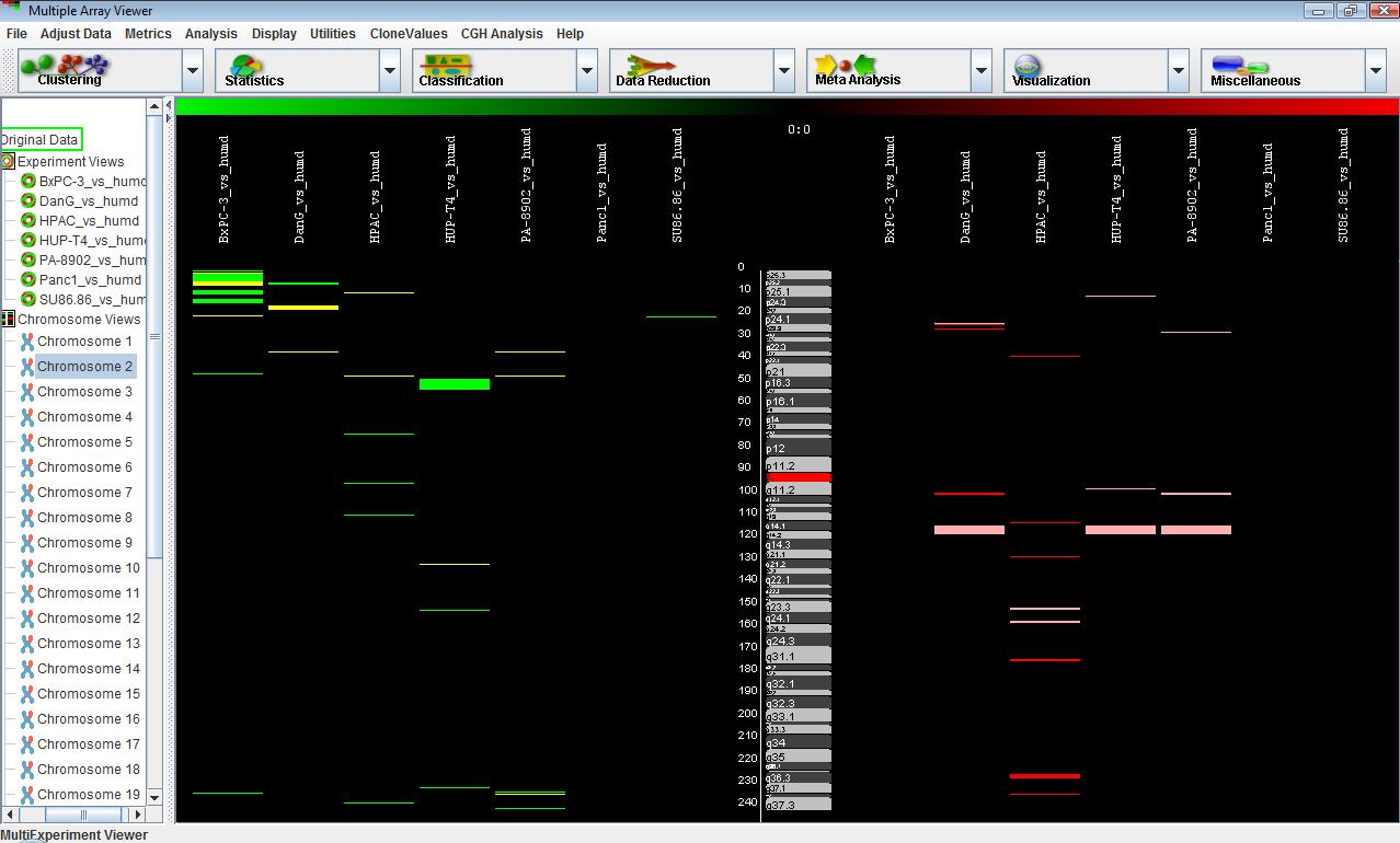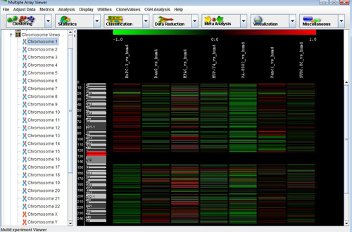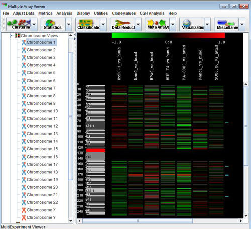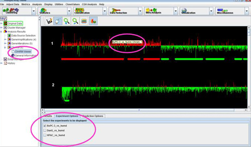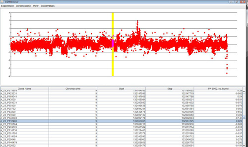 The menu of the CGH Browser can be used to toggle the display between each experiment that has been loaded, or all experiments. The menu of the CGH Browser can be used to toggle the display between one chromosome or all chromosomes.
