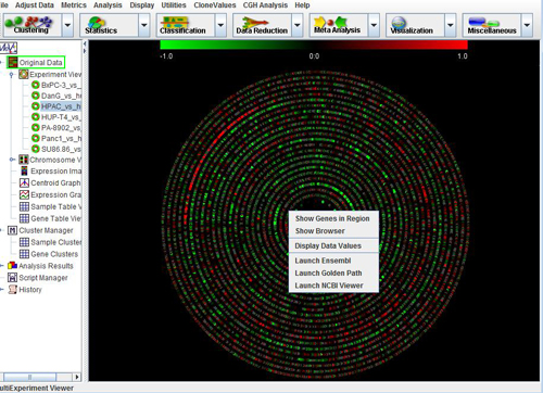 Click on any clone in the circle viewer to display its clone name and chromosome. Right Clicking on any region will display a menu to browse RefSeq genes in the region, Launch CGH browser on a sample, Map out to public domain sites like NCBI, etc.