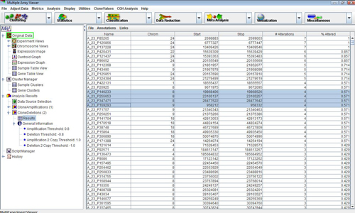 The items are used to search for probes that are commonly altered throughout the experiments. Click on the item. Notice that a subtree has been added to the Analysis node of the navigation tree on the left side of the screen. Expanding this tree and selecting the node will set the main view to display a table showing the number and percentage of experiments in which each clone is deleted.