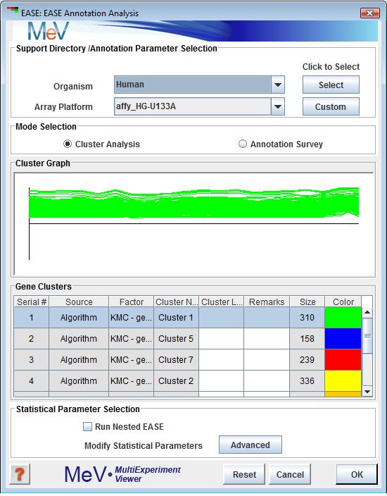 There are two main ways in which users can operate the MeV implementation of EASE annotation analysis on a given gene cluster: a default run and a custom run.