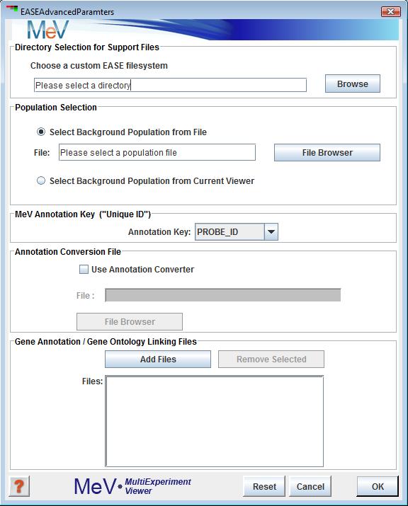 This mode is designed for tailored runs and can be used by clicking the “Custom” button at the top of the EASE Annotation Analysis dialog. Among the several parameters that can be specified by customizing EASE is the location of the necessary data files containing gene indices for loaded expression data, the selection of the background population against which cluster results will be compared, annotation keys used to uniquely identify genes, gene ontology files linking indices to biological themes and conversion files in case that the indices used by MeV are different than those in current linking files. Clicking on the “Custom” button on the upper right of the EASE Annotation Analysis window will bring up the EASE Advanced Parameters dialog which will allow the user to adjust default parameters to specific needs. To obtain more instructions refer to the “Advanced Parameters Dialog” section.