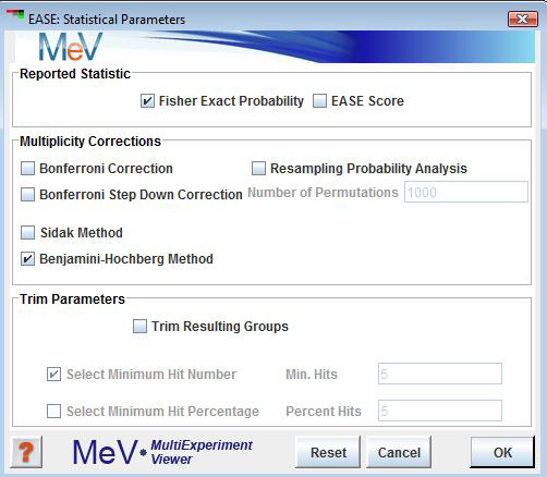 The implementation of EASE within the MeV framework provides a method to give the researcher an initial biological interpretation of gene clusters based on the indices provided in the input data set and information linking those indices to biological “themes”. These themes are generally GO terms, KEGG pathways, or any other descriptive term related to biological role or biochemical pathway information.