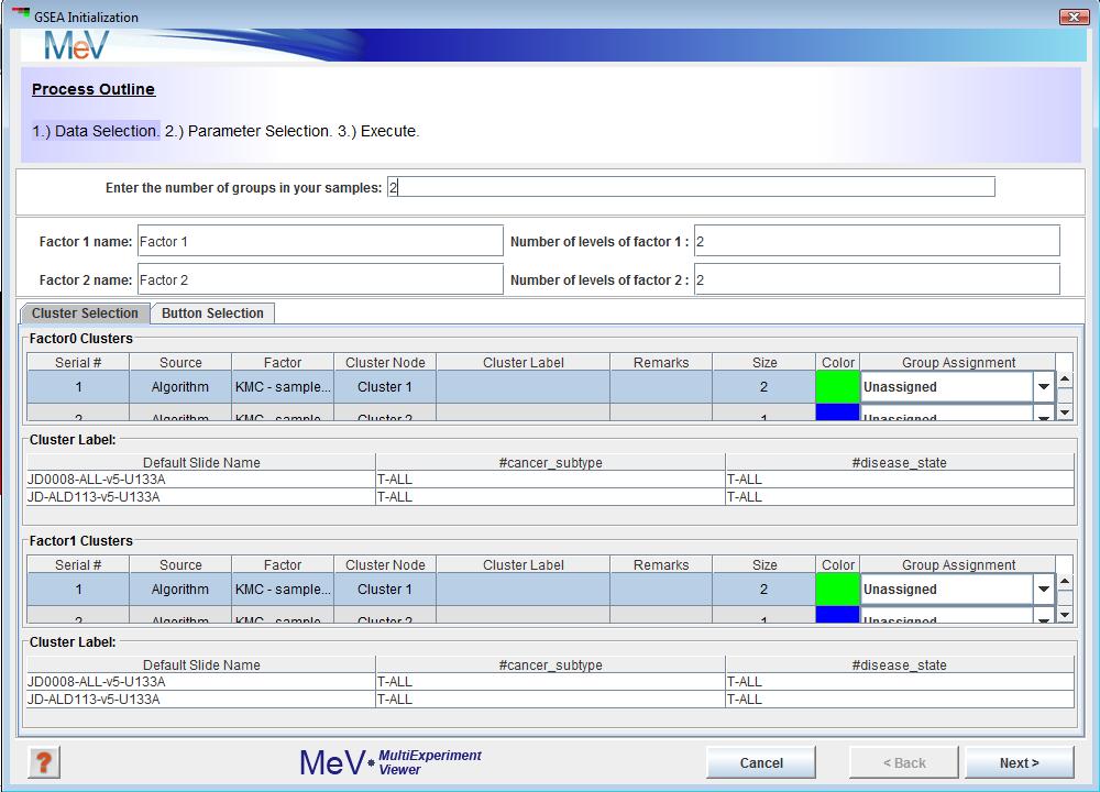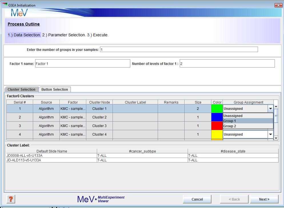 B-ALL and T-ALL are the two levels of this phenotype, so enter 2 in the textbox. If you have pre selected sample clusters and decide to use the tab just assign group numbers using the Group Assignment drop down as shown in Figure 2.
