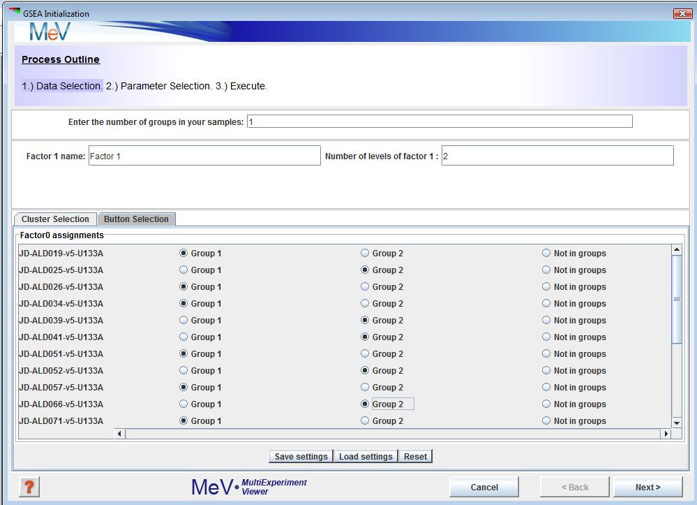 GSEA uses a set of parameter input dialogs that open sequentially to provide input options that correspond to each step of the process. The first step in the processes is data selection which lets you assign phenotype/class labels to your samples.