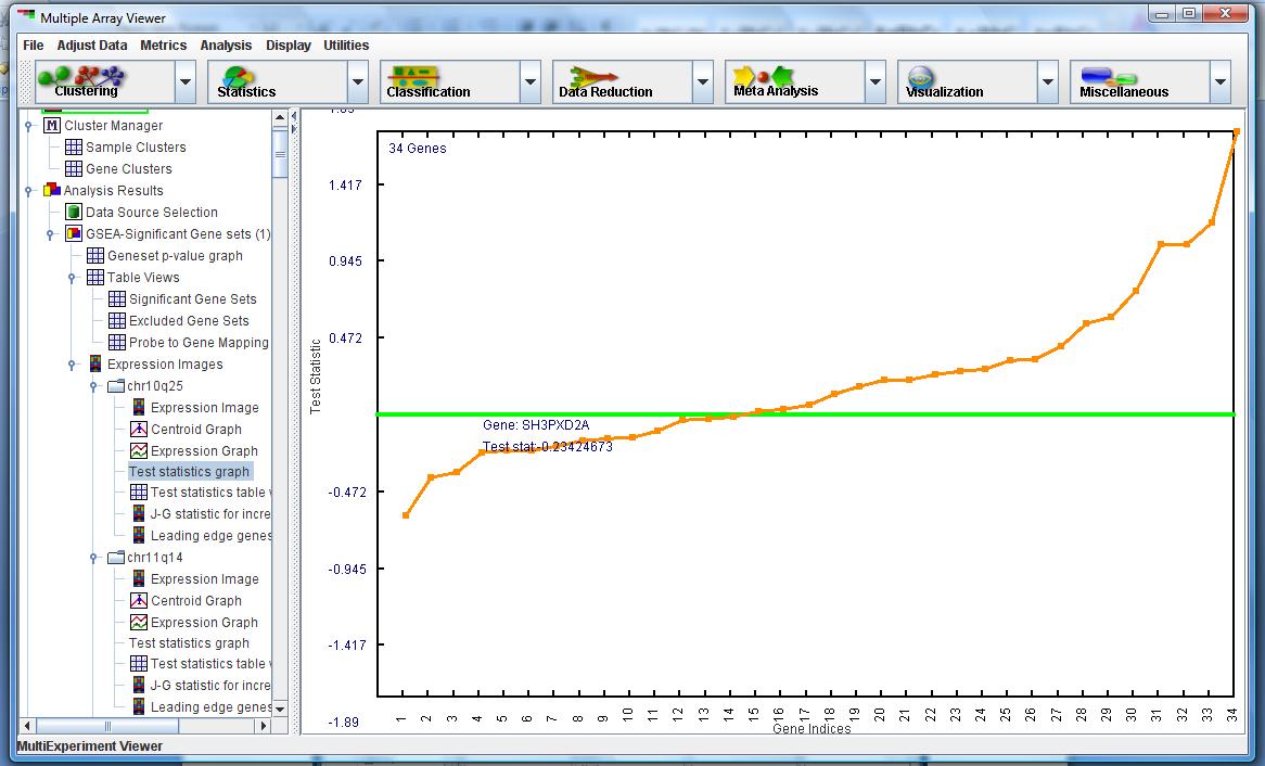 The last step is to hit the Execute button. GSEA outputs besides the standard MeV viewers three new viewers namely and . under lists gene sets sorted by their Over enriched (upper p values). Upper p values are the probability of seeing a test statistic higher than the observed one.
