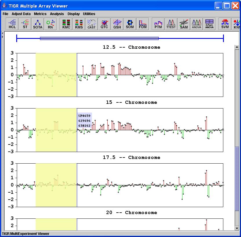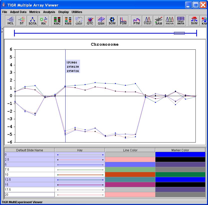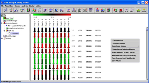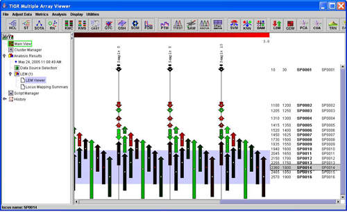 The Linear Expression Map module produces a viewer to display locus level expression information organized by chromosomal location. The LEM aligns the sampled loci from multiple samples in a single viewer so that expression patterns for loci and groups of loci can be visualized. The expression values from all spots on the slide that map to a particular locus are averaged to produce a single value for a locus. The map is highly customizable in appearance and has fine and course navigational controls to assist in stepping through the genome or chromosome being viewed. The LEM features also include options to view locus detail, options to view locus related spot annotation information, and the option to link to web resources for additional information about a selected locus.
