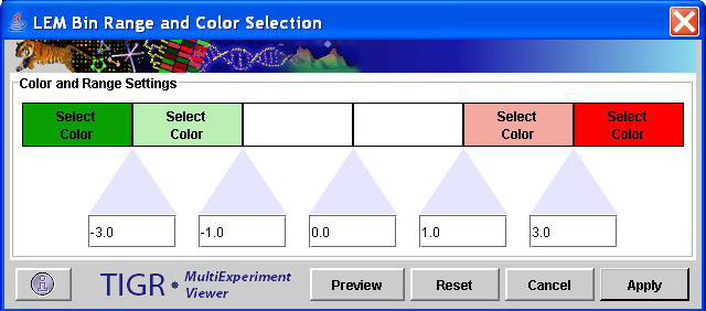 The discrete color bin modes have cutoff values and color selection options contained in a dialog that can be launched via a right click menu option labeled Bin Colors and Limits. The dialog has colored buttons that can be clicked to display a palette for color selection. Five cutoffs for the bins can be altered via text fields. In the case of the three bin mode only the outer most limits and colors are used. The values of the bins should increase from left to right. This convention is enforced to maintain valid limits when switching between 3 bin and 5 bin modes. Note that the preview button will apply the current settings to the LEM. To revert back to the original settings, use Reset and then Preview or Apply.