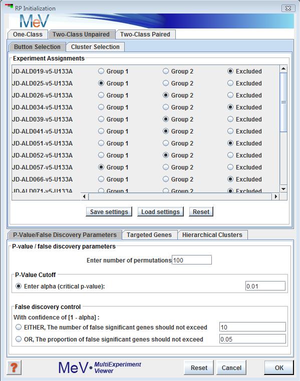 As in most other modules, MeV offers two forms of sample selection: the individual button selectionthe cluster selection tabs to assign your samples to the analysis. Samples left unassigned or unchecked will be ignored in the analysis.