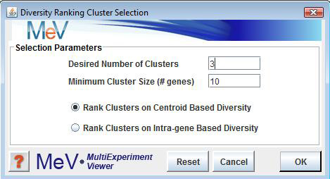 The cluster selection algorithms are specific to scripting in MeV. Automatic Cluster Selection allows the user to provide criteria for evaluating cluster results where clusters have no intrinsic identity such as “significant genes”. One scenario is the result from K-Means Clustering (KMC) where K=10. In this case, 10 clusters will be produced and the cluster selection algorithms could be used to extract clusters based supplied criteria.