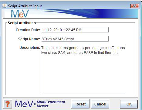Creating a script is a simple process that can be initiated by selecting New Script from the menu in the Multiple Array Viewer. Data must be loaded before this menu option can be enabled since many algorithms require data-specific information (e.g. group assignments for TTEST or SAM depend on the number and order of the loaded experiments). Once the New Script menu option has been selected, an initial dialog form will come up to allow one to enter a script name and description.