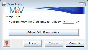 The MeV script is an XML based text document containing information about which algorithms to run, the order of the algorithms, and the source data for each algorithm. Script creation is accomplished through a graphical representation of the script to eliminate the need for the user to understand the complex structure of the script. The Document Type Definition (DTD) can be found in Section 14 Appendix (MeV’s Script DTD) for those interested in the details of script structure.