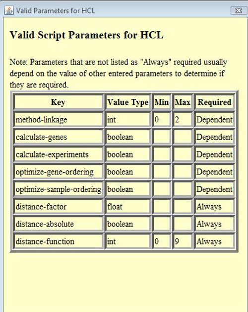 Keep in mind that caution should be used when changing script parameters so that downstream algorithms that are dependent on results are still valid. The parameter input dialog only permits alteration of the parameter’s value. A button on the dialog, labeled will produce a table of possible parameters for the algorithm being modified. The list contains parameter names, parameter types, optional constraints (value limits), and whether the parameter is required in all cases or if it is dependent on other parameter selections.Loading of saved scripts is done by selecting from the File menu of the Multiple Array Viewer. A file selection dialog will automatically launch to prompt for the selection of a script file. Scripts should be stored in the script directory of MeV’s data directory to ensure proper validation.