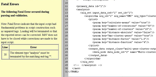 During script loading several levels of script validation occur. (usually malformed XML), (script that does not match the Document Type Description (DTD)), , and algorithm (missing required parameters, parameter type mismatch, or parameter out-of-bounds errors) are caught during the validation. If multiple validation errors exist, all will be reported. All validation errors are reported in a Script Error Log dialog. The Error Log initially lists the errors and indicates a line number for each error. The button launches an XML viewer that can be modified and saved to address the errors. Once the dialog is closed, the script should be re-loaded using the File menu to begin a fresh script loading and validation.