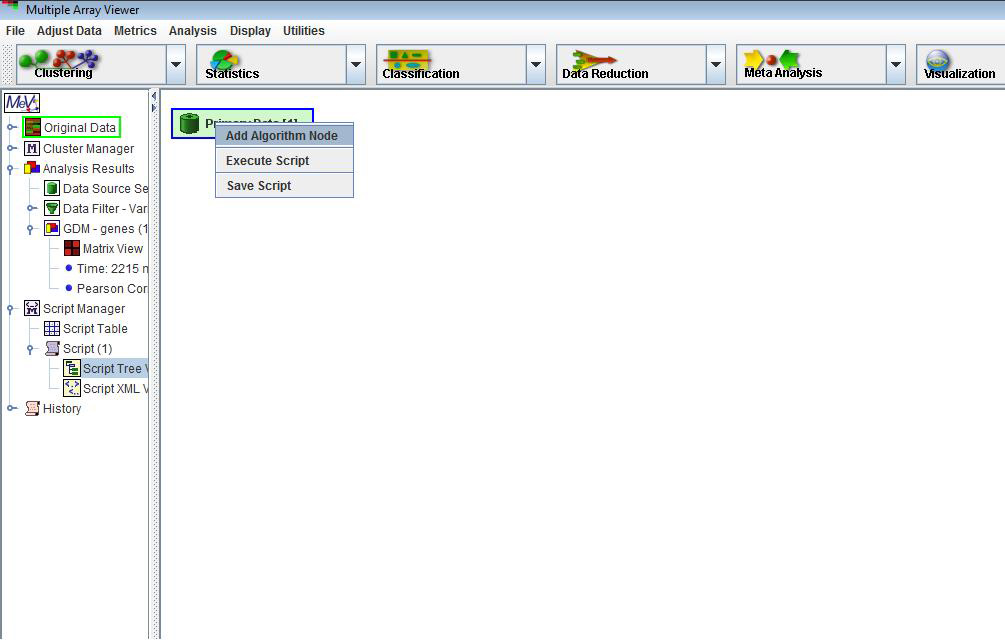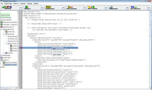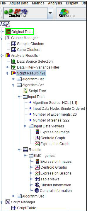 Script execution can be initiated from the Script Table viewer, the Script Tree Viewer, or the Script XML Viewer by using the right click menu option, . The script is logically split up into units called that represent one or more algorithms sharing a common input data source. The output results are grouped into algorithm sets and since each algorithm set has a unique input data set that can be a subset of the loaded data, an input data node is used to display the input data for the algorithm set. The figure displaying script analysis output clearly shows the expected output from a script containing one algorithm (SAM). The node shows the number of experiments and the number of genes as well as three cluster viewers. The node in the output for an algorithm set helps to orient the researcher as to which part of the script falls within the enclosing algorithm set. The algorithm set, input data, attached algorithms and the result data nodes, are highlighted while other script nodes are semi transparent.
