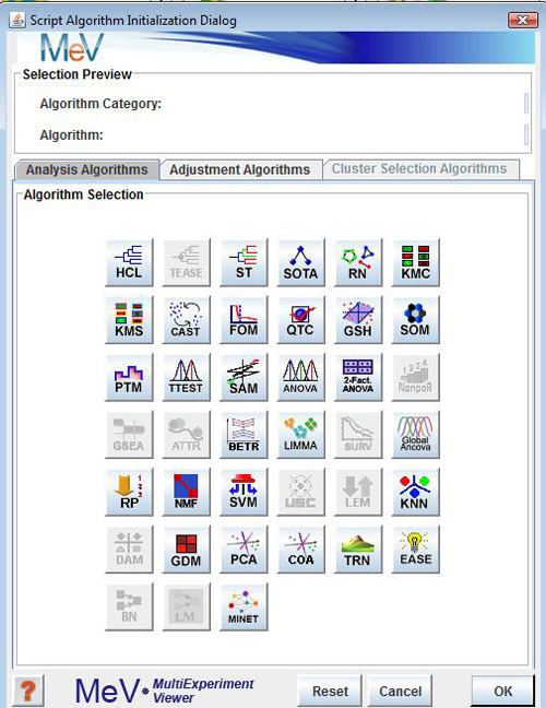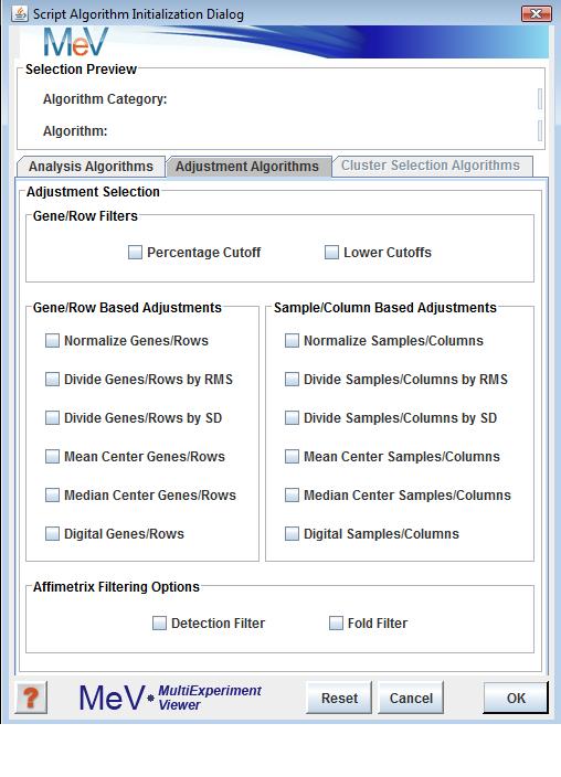 The algorithms fall into three main categories represented on three tabbed panels in the Algorithm Selection Dialog. Analysis Algorithms include gene and experiment clustering algorithms, classification algorithms, statistical algorithms, and data visualizations. The analysis algorithms are all described in the section of the manual. The Adjustment algorithms are those algorithms found in the Adjustment menu of the Multiple Array Viewer interface and include the Affymetrix™ based filters if Affymetrix ™ data is currently loaded. The Adjustment algorithms either filter the data based on some criteria or are used to perform a mathematical transformation of the data.