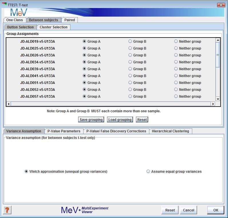 In the between-subjects design, samples can be assigned to one of two groups, and genes that have significantly different mean log2 expression ratios between the two groups are assigned to one cluster, while the genes that are not significantly different between the two groups are assigned to another cluster. The user may choose to exclude some samples from the analysis, which can be done by selecting the “neither group” option for those samples in the initialization dialog (see screenshot below). For the between-subjects t-test, we can use the Welch t-test for small samples with unequal variances in the two groups (Welch 1947), or assume equal variances.