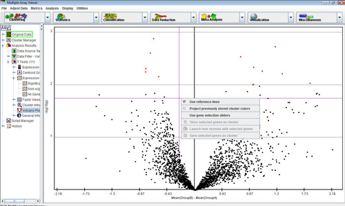 Another non-standard TTEST viewer is the volcano plot viewer. This plot shows the difference between the means of groups A and B for each gene plotted against the negative log10 p-value associated with its t-value. A volcano plot gives an intuitive visual sense of the nature of the relationship between the mean differences between groups and the statistical significance of those differences, for the data set as a whole. Right-clicking on this plot brings up options for toggling the reference lines on and off, selecting genes from the plot using slider bars, storing these selected genes as clusters, and projecting cluster colors from previous analyses on to the volcano plot.