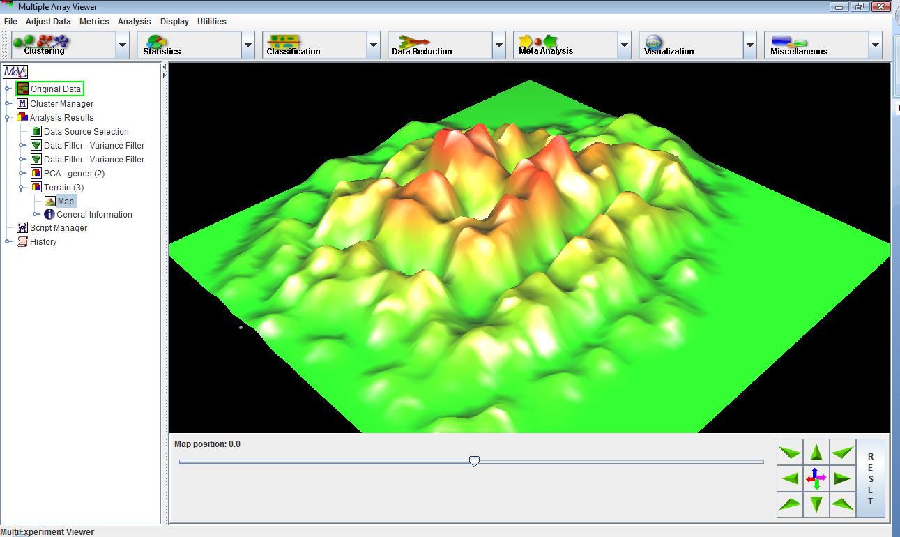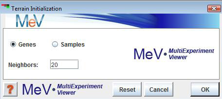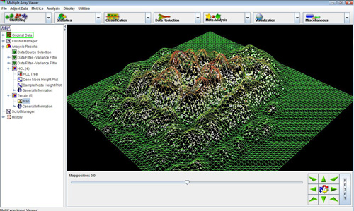 Terrain maps provide a three dimensional overview of the major clusters inherent in the data. Terrain maps can represent gene or experiment groupings depending on the mode selected in the input dialog. The input elements are first mapped into a two dimensional grid in which the placement of each element is influenced by a user selected number of nearest neighbors.
