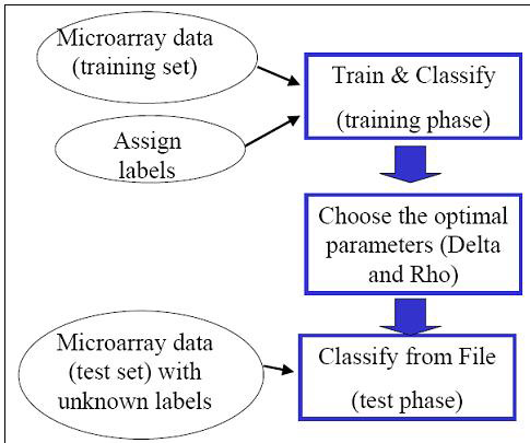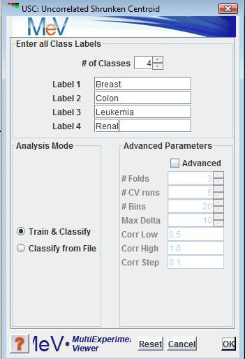 In m-fold cross validation, the training set is randomly divided into m disjoint subsets with roughly equal size. Each of these m subsets of experiments is left out in turn for evaluation, and the other (m-1) subsets are used as inputs to the classification algorithm. Since the USC algorithm is essentially run multiple times on different subsets of the training set, the cross validation step in the training phase is quite computationally intensive. The end result of the training phase is a table of the average number of classification errors in cross validation and the average number of genes selected corresponding to parameters Delta Δ and Rho ρ. Depending on the dataset being analyzed, there might be a trade-off between the average number of errors and the number of genes selected. The user will be asked to select one set of parameters (Delta Δ and Rho ρ) to be used in the test phase in which microarray data consisting of experimental samples with unknown classes will be classified.The initial dialog box allows you to choose from 2 modes of operation - or . The option ‘Train & Classify’ should be used for the training phase or if both the training and test sets are uploaded as one microarray data. The option ‘Classify from File’ corresponds to the test phase of the algorithm, and assumes that a classifier has been previously built.